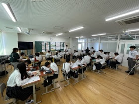 8年生の国語です。大阪府教育センターで研修している先生が教えてくれます。今、学習しているのはプレゼンテーションについて。実は5年生から「大阪の代表する良いものを教えてください」と依頼があったそうです。5年生へのプレゼンに向けて計画を練ります。